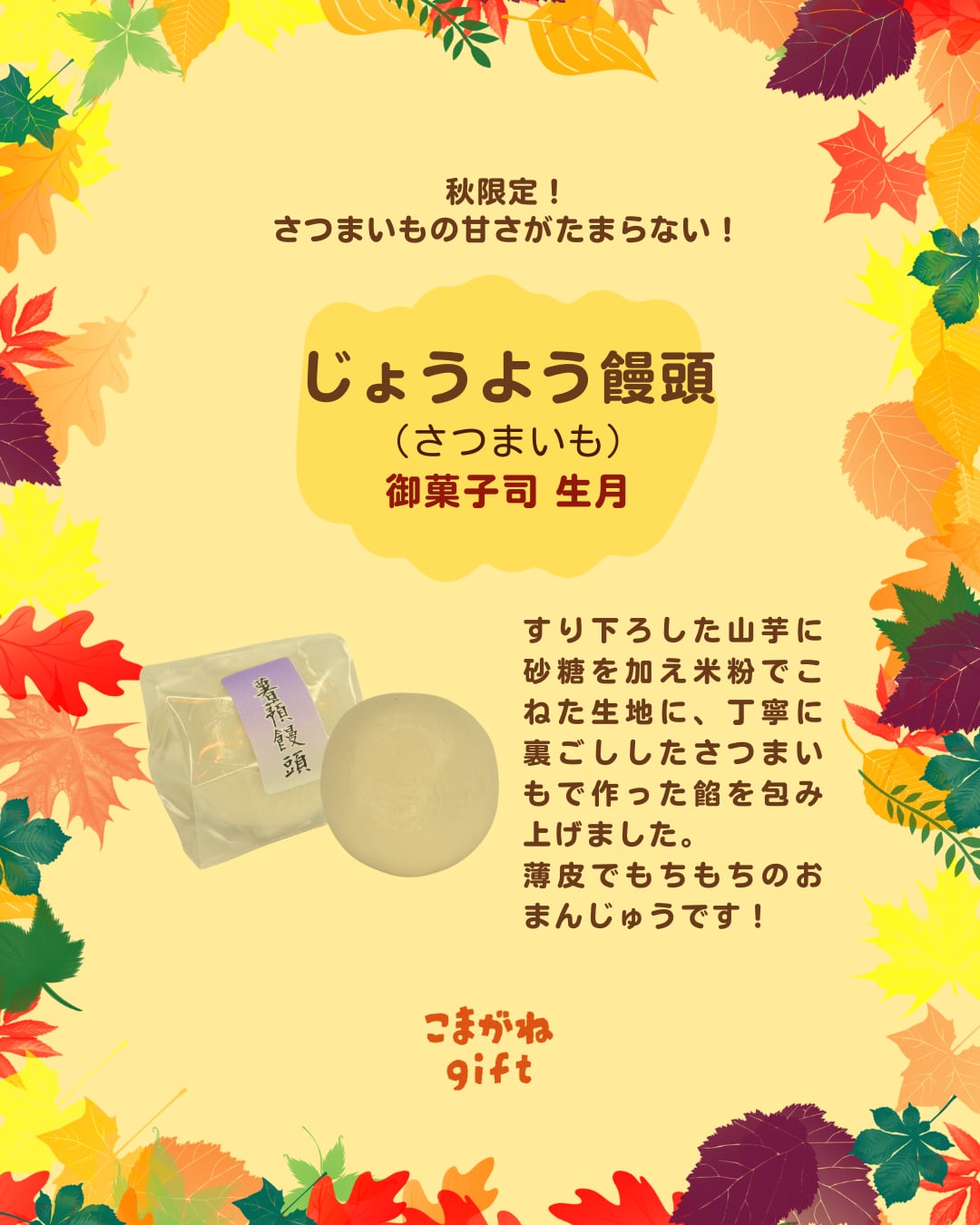 擦り下ろした山芋に砂糖を加え米粉でこねたもちもちの生地に、丁寧に裏ごししたサツマイモで作った餡を蒸し包み上げました。さつまいもの甘さがたまらないおまんじゅうです。秋から初冬にかけての期間限定商品!