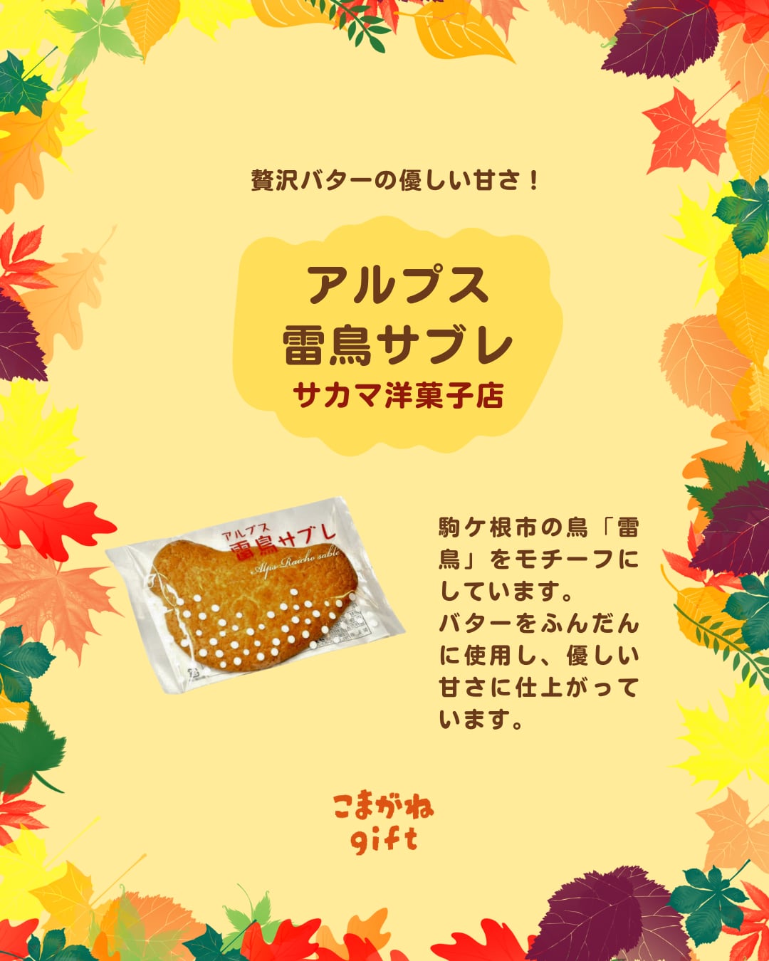 駒ヶ根市の鳥「雷鳥」をモチーフにしています。バターをふんだんに使用し、子供から大人まで愛される優しい甘さに仕上がっております。サクサク感がコーヒーと組み合わせることでやさしく溶け、絶妙なバランスが楽しめます。