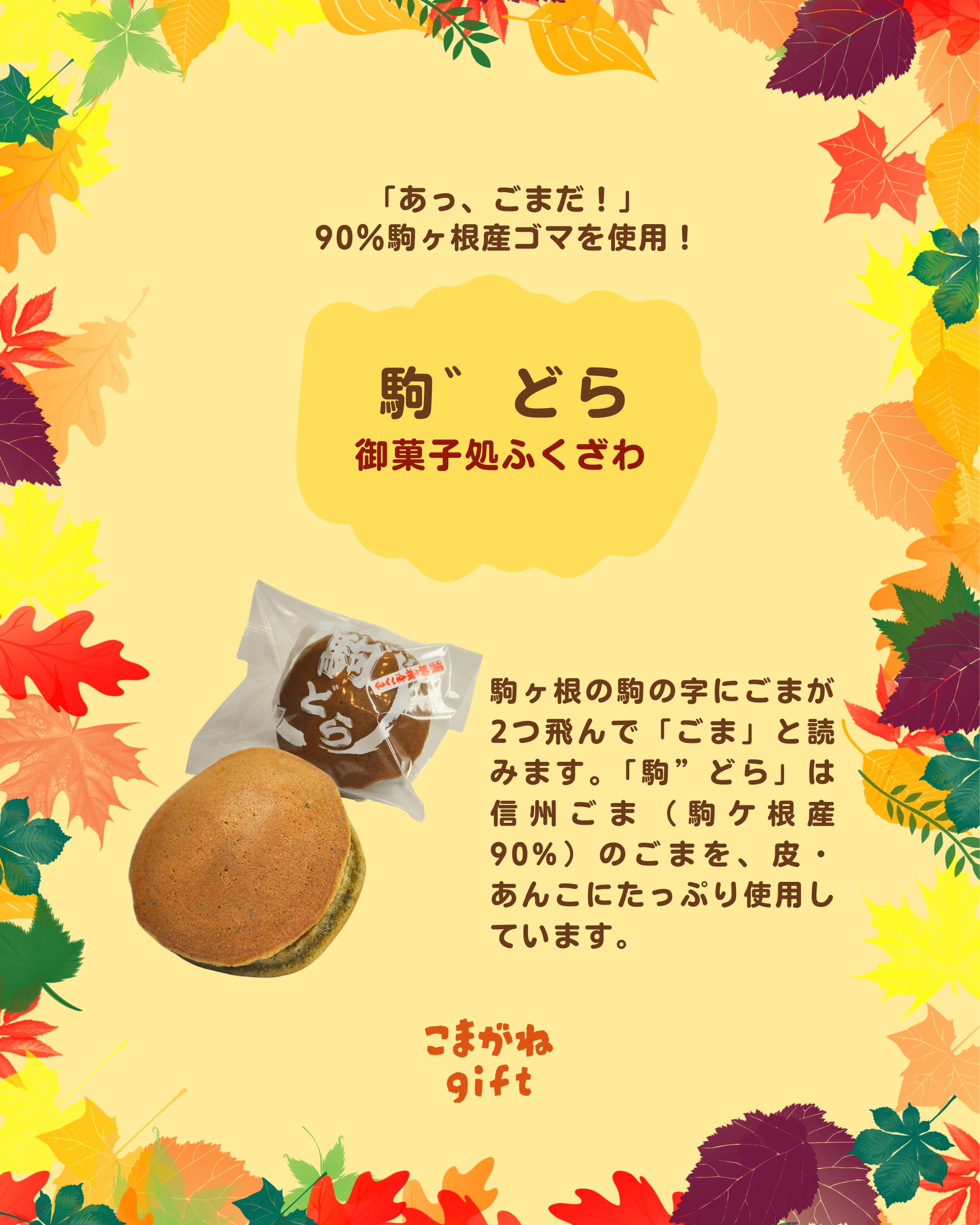 駒ヶ根の駒の字にごまが2つ飛んで「ごま」と読んで頂きます。国内産ごまは全体の1%ないと言われていますが、「駒”どら」は信州ごま(駒ヶ根産90%)のごまを皮にも、あんこにもたっぷり使用しています。1口食べて「あっ、ごまだ!」って感じる味と香り。独特の製法と配合で一味違う、駒ヶ根のお土産としても喜ばれている「駒”どら」を是非お楽しみください!